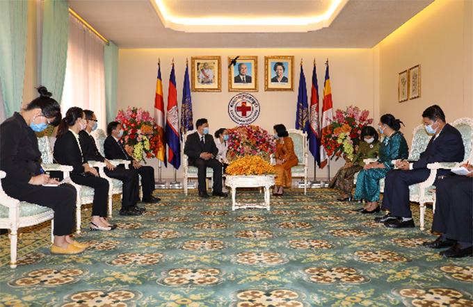 柬埔寨王国当地时间4月1日下午4:00(北京时间17:00),一场“红豆集团捐赠柬埔寨红十字会100万只口罩接收仪式”正在柬埔寨红十字会会长、柬埔寨王国首相洪森夫人文拉尼亲王的办公室内举行。中国驻柬埔寨大使馆经济商务参赞处参赞邬国权、西哈努克港经济特区公司总经理曹建江和柬埔寨红十字会副会长ANY SOKAN、秘书长POM CHANNY,柬埔寨红十字会卫生局局长SOK LONG等出席活动。